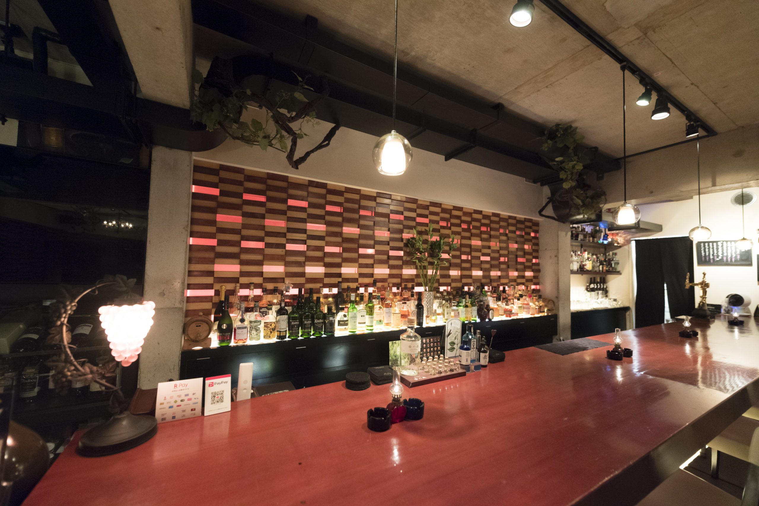 まるでアート作品のようなウッドウォールが印象的な、心地いい空間で癒しの一杯を。自家製ピザなどのフードも充実している。